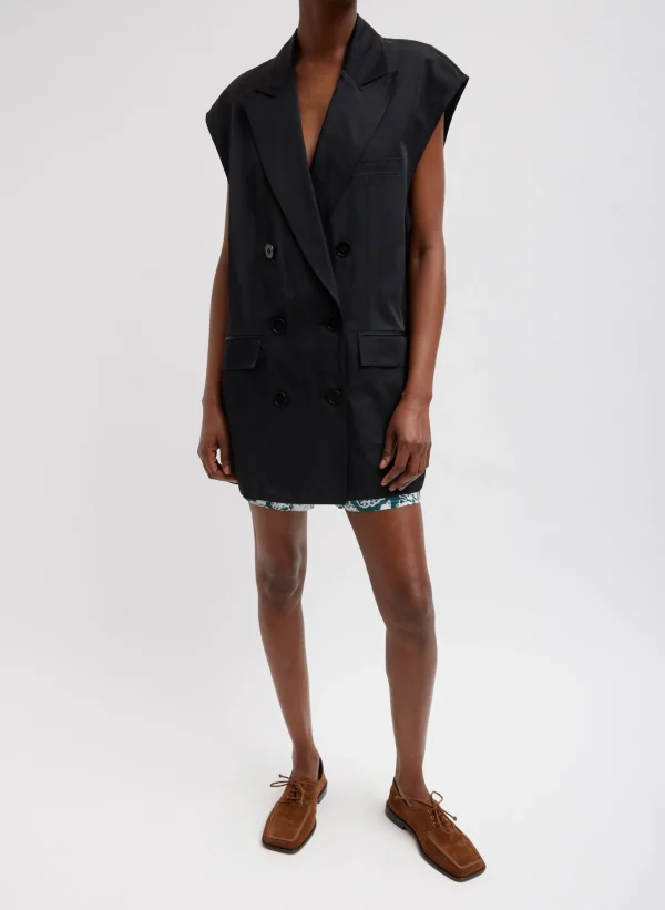 The Drapey Suiting Oversized Double Breasted Vest is our newest variation on Tibi’s most versatile cut. Updated in a Japanese cotton blend that transcends all twelve-months of the year, this style is engineered to be oversized, layering effortlessly over lighter weight fabrication and inclusive of an internal button closure to optimize on alt silhouettes to maximize on style impact. Layer on top of The Marit Pull-on Pant in a like hue for a fresh take on summer suiting or pair back with the Recycled Nylon Batik Pull Skirt to experiment with the season’s novelty print. Consider this vest to be the value-add jacket you never knew you needed…and now possibly cannot live without.